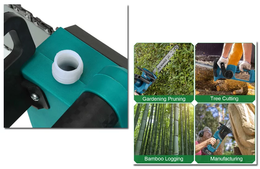 AKU reťazová pila je pohodlne použiteľná, tichá a vďaka bezpečnostnému spínači tiež bezpečná. Píla má automatické mazanie reťaze, vďaka vlastnej nádobke na olej. Súčasťou balenia je okrem píly vodiaca lišta – 12 palcov ( cca 30,4 cm ), reťaz, náradie potrebné k montáži a 2 batérie.