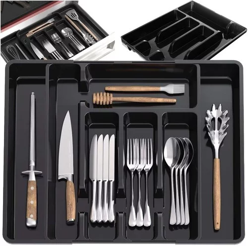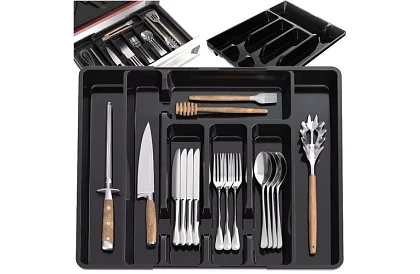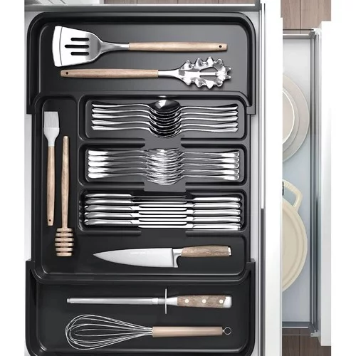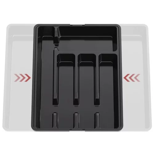 Organizér poskytuje maximálny prehľad a poriadok v zásuvkách, šetrí čas pri hľadaní príbory a kuchynského náradia. Vďaka nastaviteľnému výsuvnému mechanizmu sa prispôsobí rôznym šírkam zásuviek a pojme všetky príbory aj doplnky. Elegantný čierny dizajn dopĺňa moderný vzhľad kuchyne a odolný materiál zaručuje dlhú životnosť.