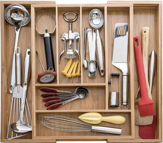 Praktický a elegantný pomocník pre prehľadné usporiadanie príbory a kuchynského náradia. Vďaka rozšíriteľnej konštrukcii sa prispôsobí veľkosti zásuvky a ponúkne 6 až 8 priehradiek podľa potreby. Prírodné bambusové drevo pôsobí esteticky, je hygienické a vhodné na každodenné použitie v modernej aj klasickej kuchyni. Organizér pomáha udržiavať poriadok, chráni príbory a zabezpečuje rýchly prístup pri varení aj stolovaní.