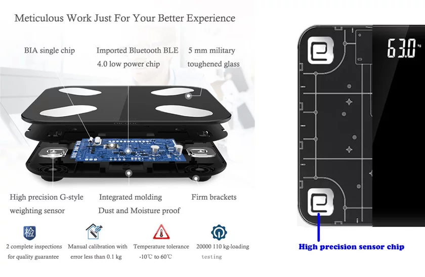 Vďaka vstavanému Bluetooth modulu môže váha vykonávať detailne meranie telesnej hmotnosti, vypočítať BMI, merať telesný tuk, obsah vody v tele, stav kostnej a svalovej hmoty. Plošina váhy je vyrobená z tvrdeného skla.