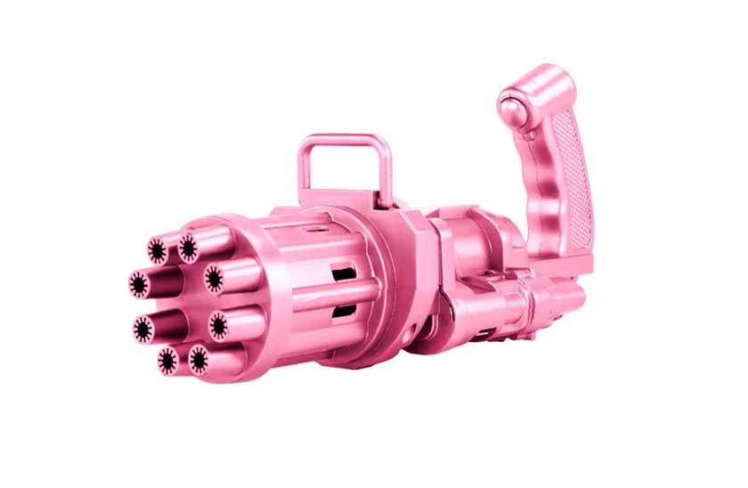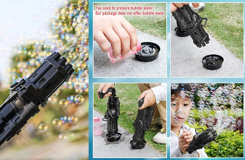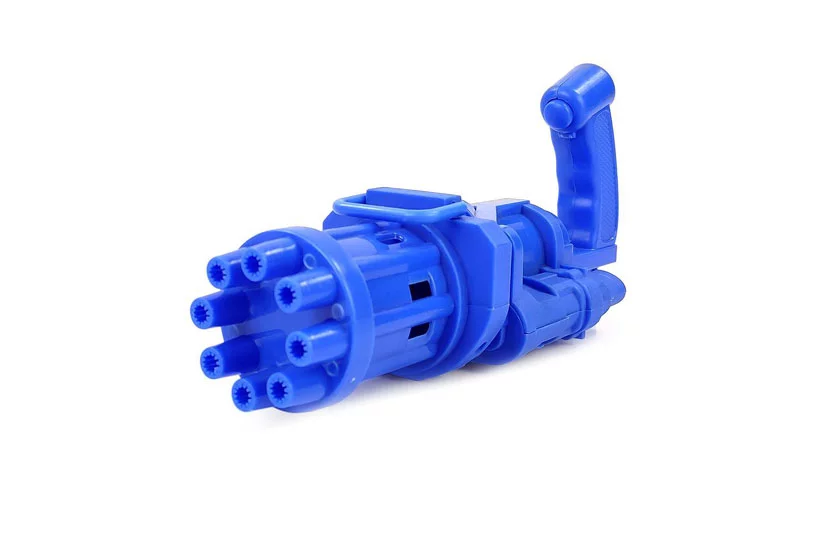 Bubble Gun – guľomet na bubliny pro deti. Vytvára hromadu bublín a prináša viacej zábavy pro deti. Jednoduché a pohodlné ovládanie, ideálny na vonkajšie aj vnútorné hranie. Tiež skvelá párty hračka pre deti i dospelých. Bublinkový guľomet má 8 bublinkových otvorov , vďaka ktorým je schopný vyfúknuť stovky bublín behom okamžiku.