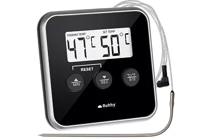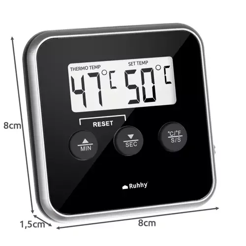 Tento teplomer je ideálnym pomocníkom pri príprave mäsa, tekutín alebo olejov a umožní vám ľahko kontrolovať teplotu s presnosťou až na jeden stupeň. Veľký a prehľadný LCD displej zaisťuje jednoduché čítanie hodnôt, zatiaľ čo magnet na zadnej strane umožňuje pripevnenie teplomeru na kovové povrchy, ako je chladnička, rúra alebo gril. Funkcia zvukového alarmu vás upozorní, akonáhle teplota dosiahne nastavenú hodnotu, a praktický časovač uľahčí presné sledovanie doby varenia.