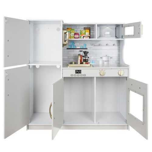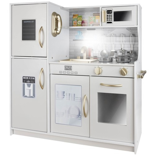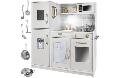 Štýlová drevená kuchyňa XL ponúka deťom realistický zážitok z varenia plný svetelných a zvukových efektov. Vďaka LED lampe, pohyblivým častiam a bohatému príslušenstvu si deti môžu hrať na skutočných kuchárov, rozvíjať fantáziu a učiť sa hrou. Kuchyňa je bezpečná, odolná a navyše krásne doplní detskú izbu.