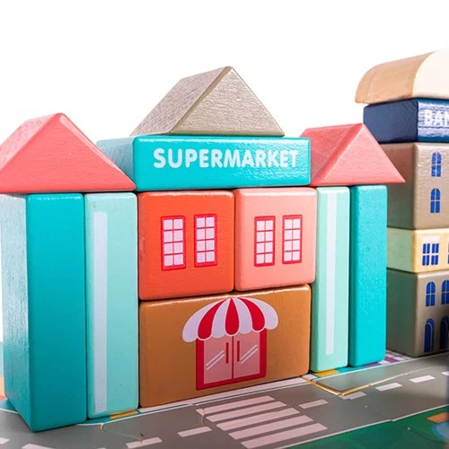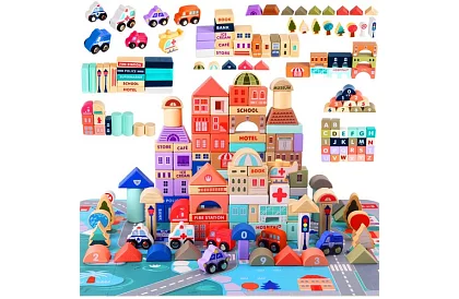 Postav si vlastné mesto plné fantázie a dobrodružstva! Sada drevených kociek umožňuje deťom vytvoriť mesto podľa svojich predstáv – od banky, cez školu, až po nemocnicu a záchranárske vozidlá. Hranie rozvíja kreativitu, jemnú motoriku, koordináciu a logické myslenie, a zároveň ponúka množstvo zábavy. Kocky sú vyrobené z kvalitného dreva, majú hladké hrany a sú natreté netoxickými farbami, čo zaisťuje bezpečnosť pri hraní.