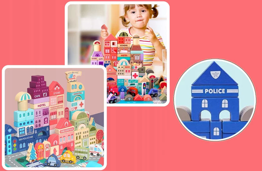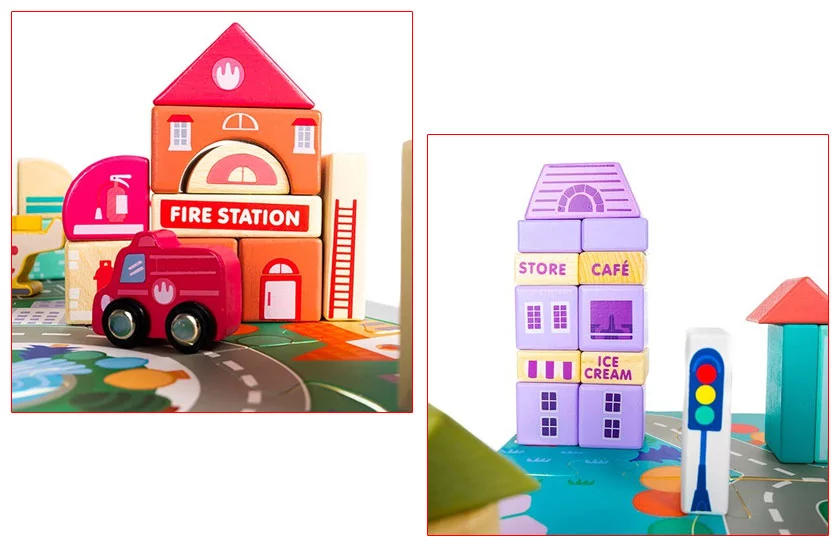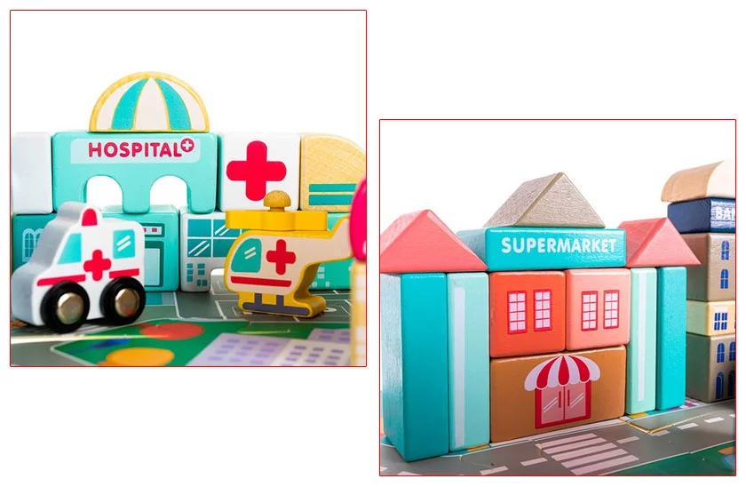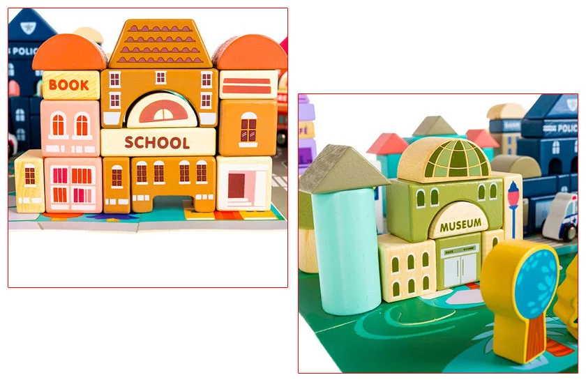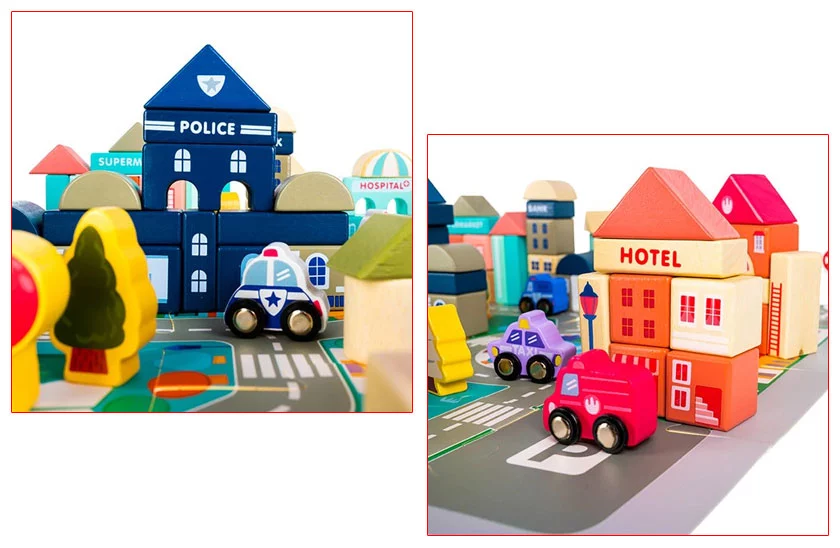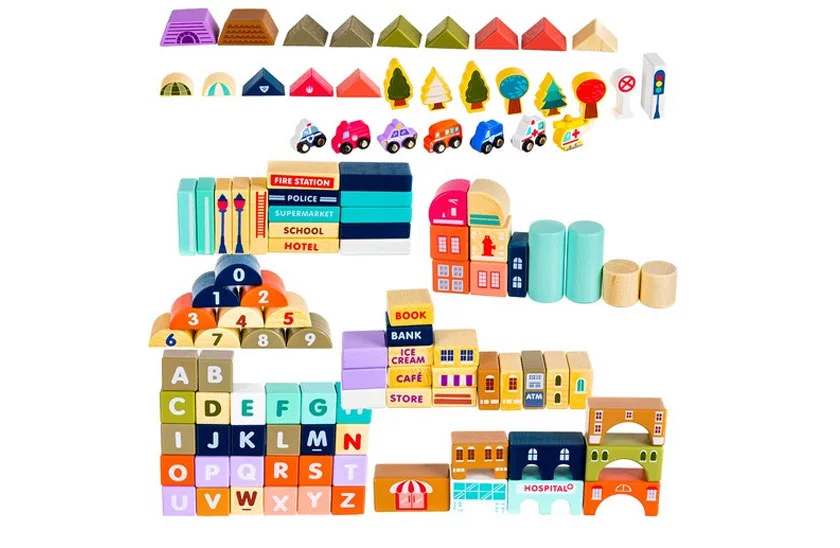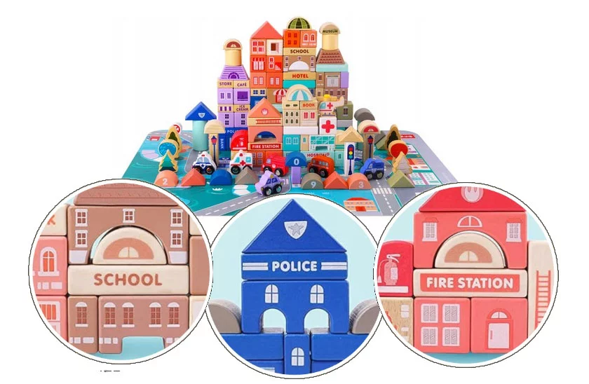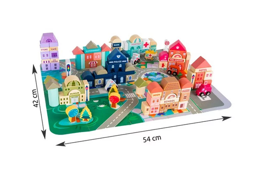 Postav si vlastné mesto plné fantázie a dobrodružstva! S touto rozsiahlo sadou drevených kociek môžu deti vytvoriť mesto podľa svojich predstáv – od banky, školy až po nemocnicu a záchranárske vozidlá. Skvelá zábava, ktorá nielen baví, ale aj rozvíja!
