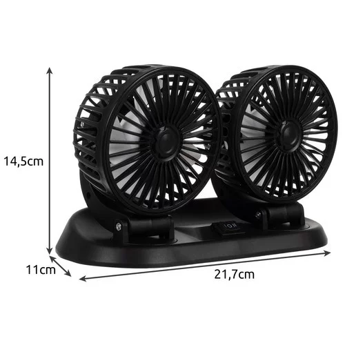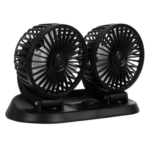 Dvojitý ventilátor do auta zabezpečí pohodlnú a sviežu cestu pre vodiča aj spolujazdcov. Vďaka dvom hlaviciam s možnosťou 360° otáčania a dvojstupňovej regulácii rýchlosti je možné prúd vzduchu nasmerovať presne tam, kde je potrebné. Nezávislé nastaviteľné hlavy umožňujú každému cestujúcemu prispôsobiť prúdenie vzduchu podľa svojich potrieb. Ventilátor je napájaný z 12V zásuvky zapaľovača cigariet, a je tak kompatibilný s väčšinou osobných aj úžitkových vozidiel.