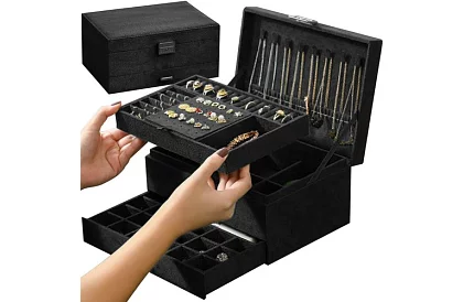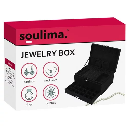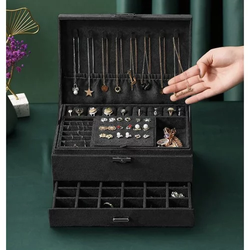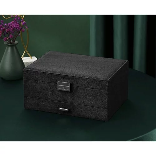 Elegantná a praktická šperkovnica, ktorá vám pomôže udržať dokonalý poriadok vo vašej zbierke šperkov. Vďaka premyslenému vnútornému usporiadaniu ľahko uložíte prstene, náhrdelníky, náušnice, náramky aj hodinky tak, aby boli chránené, prehľadne usporiadané a vždy po ruke. Nadčasový dizajn v čiernej farbe so striebornými detailmi pôsobí luxusne a hodí sa do každého interiéru.