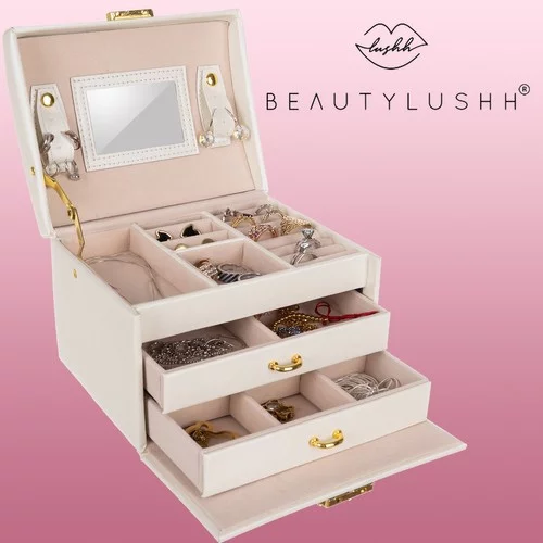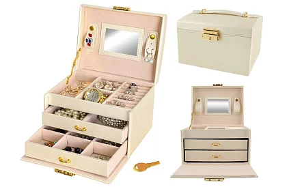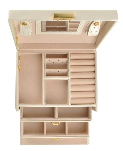 Šperkovnica je praktický a bezpečný spôsob, ako uchovávať šperky, hodinky, mince a ďalšie cennosti. Vďaka niekoľkým priehradkám, zásuvkám a rolkám budete mať svoju zbierku vždy prehľadne usporiadanú a kľúčový zámok zabezpečí bezpečnosť obsahu. Nadčasový béžový saténový povrch s elegantnými detailmi dodáva šperkovnici luxusný vzhľad.