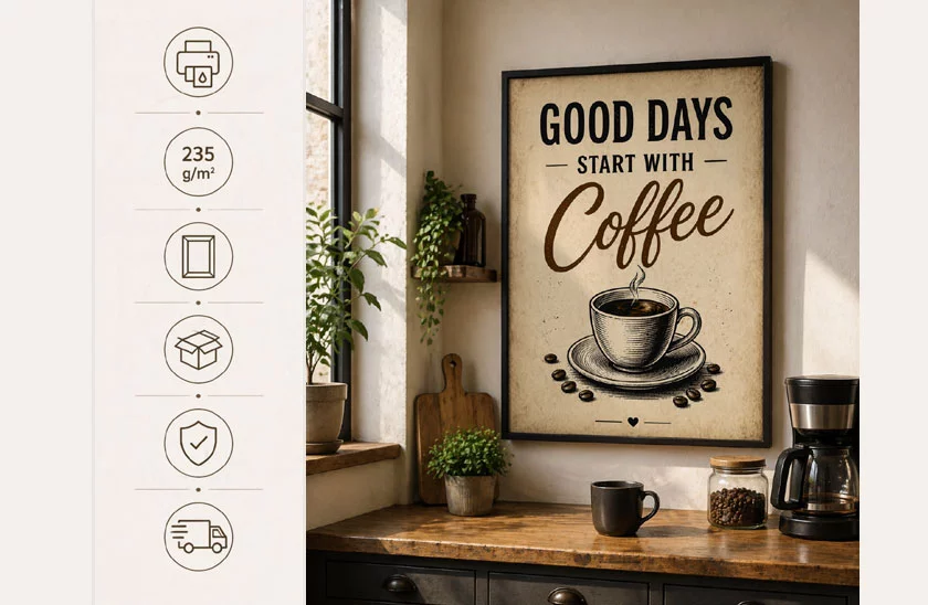 Štýlový obraz s motívom kávy premění bežný interiér na útulné a inšpiratívne miesto. Elegantný vzhľad sa hodí do kuchyne, jedálne, kancelárie i domáceho coffee corneru. Kvalitný tlač na pevném fotografickom papieri ponúka ostré línie, krásne farby a prémiový dojem. Skvelá voľba tiež ako darček pre každého, kto miluje kávu.