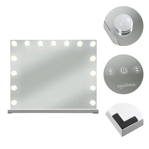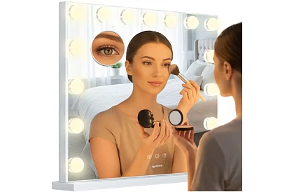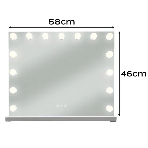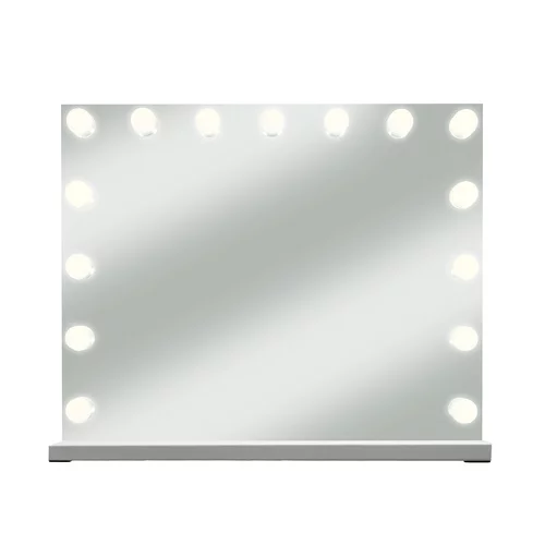 Elegantné kozmetické zrkadlo v hollywoodskom štýle poskytuje profesionálne osvetlenie pre dokonalé líčenie, starostlivosť o pleť aj úpravu vlasov. Vďaka 15 LED žiarovkám a možnosti voľby troch farieb svetla ponúka ideálne podmienky pre každodenné styling. Dotykové ovládanie, plynulé nastavenie jasu a veľká zrkadlová plocha zabezpečujú komfort pri používaní doma aj v kozmetickom salóne.
