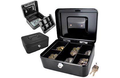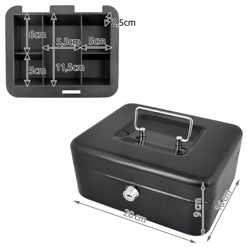 Kovová pokladnička je spoľahlivým riešením na bezpečné uloženie hotovosti, drobných cenností a dokumentov v domácnosti, kancelárii a pri prenášaní. Pevné kovové steny a pevná konštrukcia zaisťujú vysokú odolnosť a zabraňujú ľahkému vniknutiu. Vo vnútri sa nachádza vyberateľná priehradka na mince, pod ktorou je skrytá priehradka na väčšie a dôležitejšie predmety. Schránka na mince je ľahká a vďaka zapustenej rukoväti ľahko prenosná bez rizika poškodenia alebo rozpojenia konštrukcie.