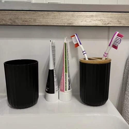 • Hrnček na zubné kefky a pohár na vyplachovanie úst s bambusovým krytom