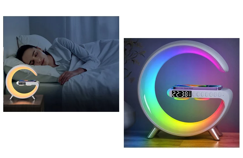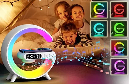 Štýlový Bluetooth reproduktor s dúhovým podsvietením, zobrazovača času, USB-C vstupom a bezdrôtovým nabíjaním. Táto stolná LED lampa hrá všetkými farbami. Designová multifunkčná lampička poteší každého, kto má rád hudbu. Zároveň si ale dokážete posvietiť na pracovní dosku, a dokonca i nabiť telefón. Vďaka modernému designu a funkciám poteší nie len školákov a študentov, ale hodí sa i ako dekoratívny prvok do domácností.