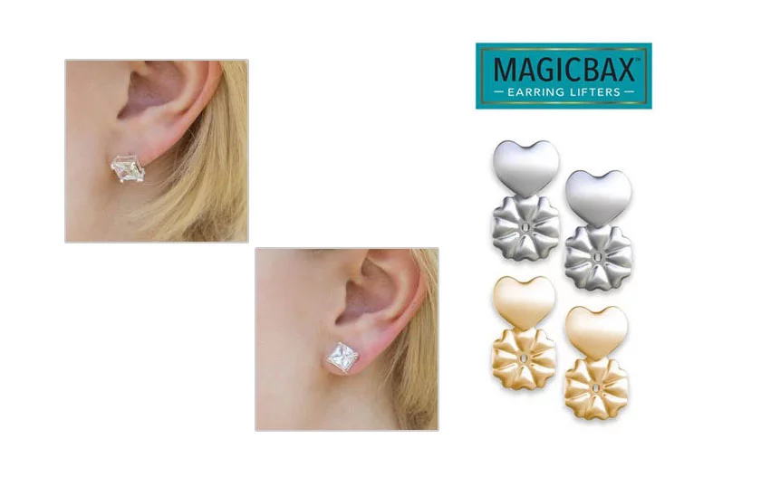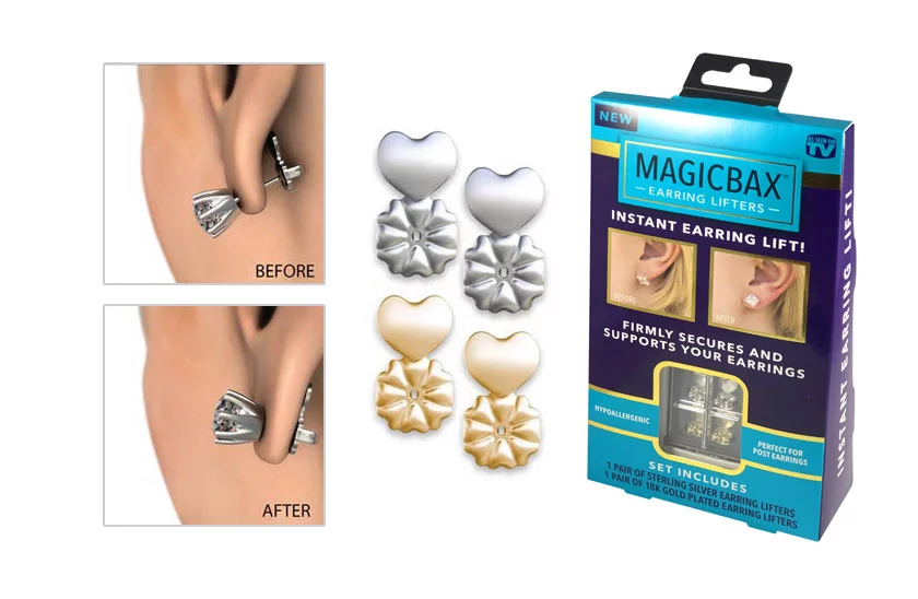 Sú ideálne, pokiaľ máte pretiahnuté ušné lalôčiky, alebo nosíte ťažké náušnice – Magic Bax puzetky náušnice nadvihnú a udržia ich vo vzpriamenej polohe po celý deň. Ich použitie je pohodlné a bezpečné, sú potiahnuté striebrom a 14K zlatom a sú hypoalergénne.