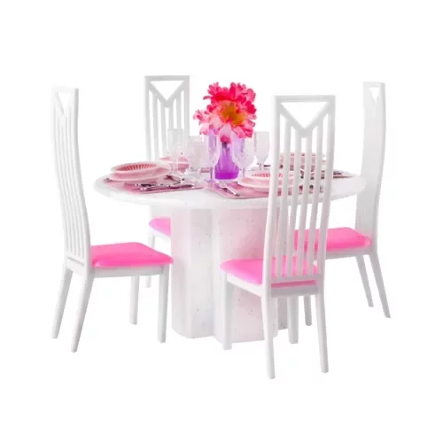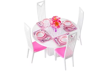 • Kompletná jedálenská sada – obsahuje stôl, 4 stoličky, taniere, príbory a poháre, ktoré umožňujú realistickú hru