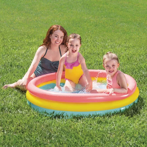 Bezpečný detský bazén s mäkkým nafukovacím dnom poskytuje pohodlie a ochranu pre malé deti pri hre vo vode na záhrade, terase alebo balkóne. Jednoduché zostavenie a skladovanie zabezpečuje rýchlu prípravu na použitie a pokoj rodičom, zatiaľ čo mäkké steny a nafukované dno chránia nožičky dieťaťa a zvyšujú komfort. Dúhové farby lákajú deti k dlhšej a zábavnej hre.