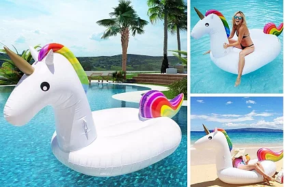 Krásny obrí nafukovací matrac na vodu v designu unikátneho farebného jednorožca. Nafukovací jednorožec oživí nejednu záhradnú párty pri bazéne. Výborná letná dekorácia nie len na dovolenku, ktorú musíte mať. Kráčajte s dobou a poriaďte si i vy toto nafukovacie ležadlo. Uvidíte, ako vo vode zažiarite!