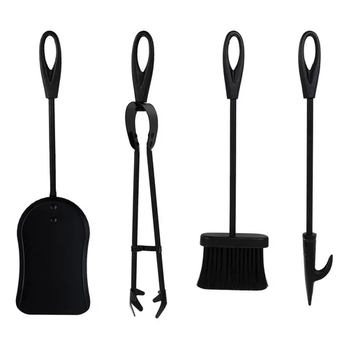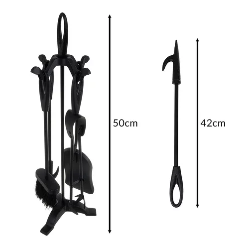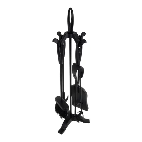 Sada retro krbového náradia kombinuje pohrabáč, lopatku, metlu, kleště a stojan do elegantného a praktického setu pre krby, kachle, ohniská či gril. Vysokokvalitná nerezová oceľ zaisťuje odolnosť voči vysokým teplotám a každodennému používaniu, zatiaľ čo čierny matný povrch dodáva vintage vzhľad a extra ochranu. Nástroje majú ergonomické rukoväte, ktoré padnú do ruky a umožňujú bezpečnú manipuláciu s horúcim ohňom, a stabilný stojan s tromi nohami drží celú sadu pevne na mieste.