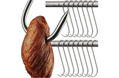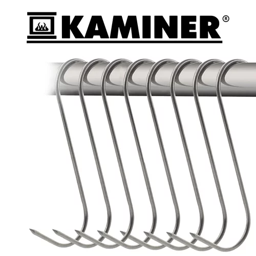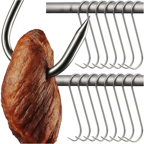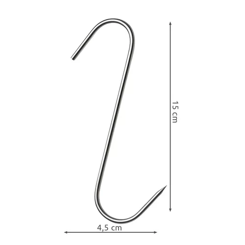 Sada háčikov z nerezovej ocele najvyššej kvality je ideálna na údenie mäsa a rýb. Odolné voči hrdzi, vysokým teplotám a vlhkosti, poskytujú bezpečné a spoľahlivé zavesenie. Špicatý hrot a tvar „S“ umožňujú jednoduché prepichnutie mäsa a stabilné zavesenie na tyči údiarne. Balené v praktickej sade 15 kusov, pripravené na okamžité použitie.