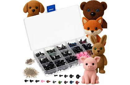 Sada umožňuje bezpečné a pevné uchycenie očí a nosov na plyšáky, bábiky alebo ručne vyrobené projekty vďaka závitovej západke s podložkou. Obsahuje 560 prvkov v rôznych veľkostiach, tvaroch a farbách, takže je možné ich ľahko zladiť s rôznymi hračkami. Montáž je jednoduchá a intuitívna, bez lepidla či náradia – stačí stlačiť západku. Súčasťou je praktický organizér s priehradkami, ktorý udržuje poriadok a pohodlie pri práci.