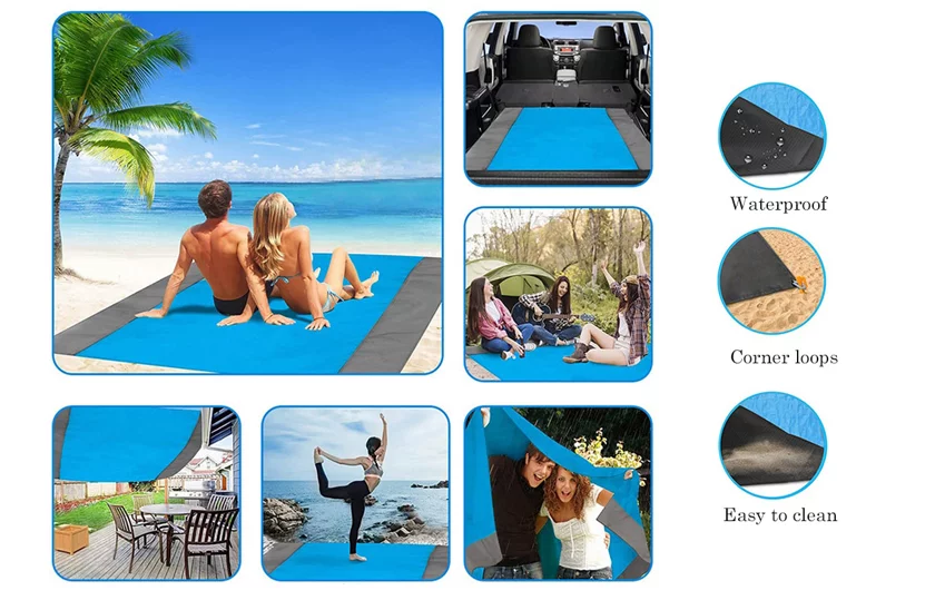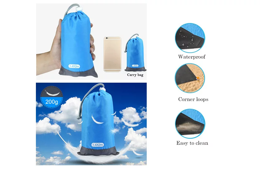 Pokrýva 210×200 cm priestoru, čo znamená dosť pro mnoho outdoorových aktivít. Plážová podložka je vyrobená z odolného nylonu, čo je nepremokavý materiál. Poskytuje pohodlie pri používaní a má vynikajúce vlastnosti na použitie na rôznych povrchoch a poveternostných podmienkach. V balení sú fixačné pomôcky, vďaka ktorým sa podložka nebude hýbať a bude stabilná.
