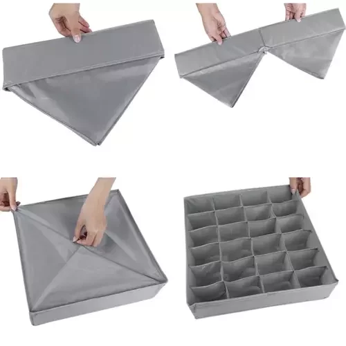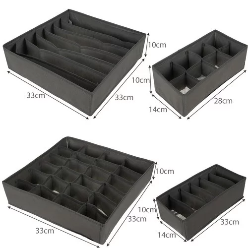 Praktická sada štyroch organizérov, ktorá zabezpečí poriadok vo vašich zásuvkách aj skriniach. Každý organizér je vhodný pre iný typ spodného prádla a pomáha rýchlo nájsť to, čo potrebujete. Vďaka skladacej konštrukcii a priedušnému materiálu sú organizéry pohodlné, odolné a ľahko sa udržiavajú.