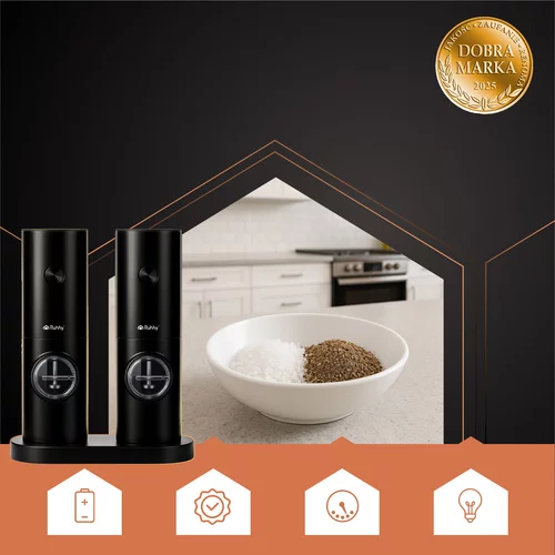 Štýlová sada elektrických mlynčekov v čiernej farbe prináša do kuchyne pohodlie, presnosť a plnú kontrolu nad korením. Keramický mechanizmus zabezpečuje dokonalé mletie bez kovovej pachuti, zatiaľ čo nastaviteľná sila mletia umožňuje upraviť hustotu od morskej soli po kajenský korenie. LED podsvietenie uľahčuje dávkovanie korenia aj za slabého svetla a priehľadné okienko poskytuje prehľad o množstve zostávajúceho korenia.