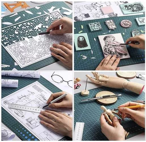 Samoopravná podložka RUHHY je praktický nástroj pre presné a čisté rezanie materiálov formátu A3, ako je papier, kartón, fólia, látka alebo hubka. Vďaka špeciálnym vrstvám samoopravného materiálu sa po reze povrch vracia do pôvodného stavu, čo zaisťuje dlhú životnosť a opakované použitie. Protisklzový materiál drží podložku bezpečne na mieste a obojstranný potlač s mierkami a čiarami uľahčuje presné rezanie a modelovanie.