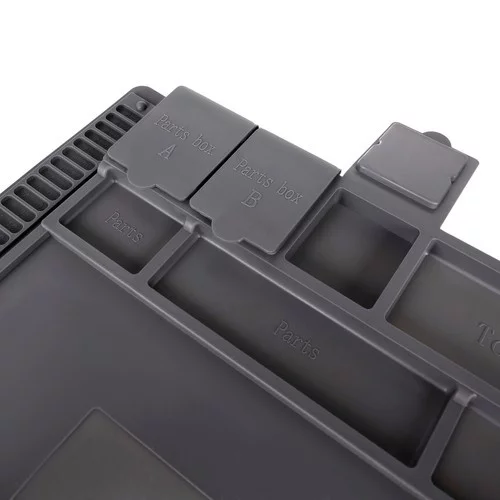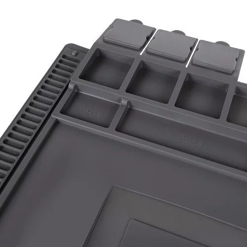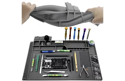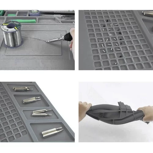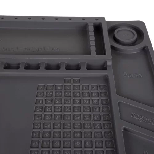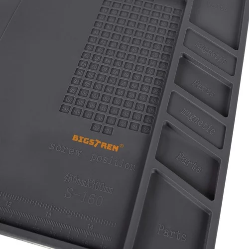Multifunkčná silikónová podložka je ideálna pre každého kutila aj profesionála. Vďaka magnetickým kapsám udrží najmenšie skrutky a súčiastky na mieste, aj keď sa podložka pohne. Odolný materiál umožňuje bezpečné používanie horúcich nástrojov a chemikálií. Prehľadné značenie a profilované miesta uľahčujú presné meranie a organizáciu nástrojov aj drobných dielov.