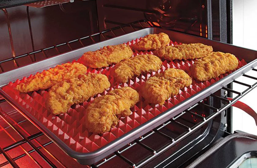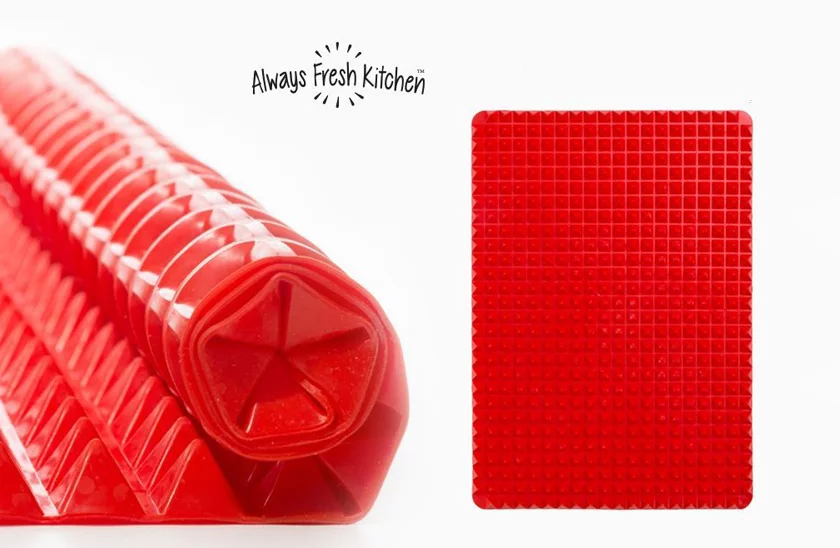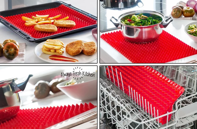 Zabudnite na papier na pečenie. Silikónová podložka na pečenie je skvelým pomocníkom do kuchyne. Vďaka povrchovej úprave sa zbavíte prebytočného tuku. Všetko čo pripravíte je chrumkavé a rovnomerne prepečené, horúci vzduch cirkuluje zo všetkých strán medzi pyramídkami. Podložka je vhodná i pod horúce hrnce. Jej čistenie je celkom jednoduché, stačí opláchnuť horúcou vodou, alebo vložiť do umývačky riadu.