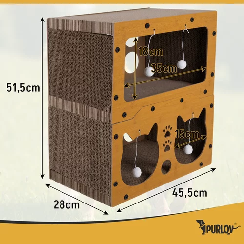 Štýlové a praktické miesto na hranie, oddych aj starostlivosť o pazúriky v jednom. Dvojpodlažná konštrukcia z pevného HDF ponúka stabilné útočisko pre každodenný relax aj aktivitu. Prírodný škrabací povrch pomáha chrániť nábytok a zároveň podporuje prirodzené správanie mačiek. Moderný dizajn zapadne do interiéru a vytvorí obľúbený kútik pre maznáčika bez kompromisov.