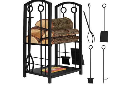 Stojan na krb s príslušenstvom je praktická a všestranná sada, ktorá vám umožní mať všetky potreby na obsluhu krbu po ruke. Obsahuje kliešte, lopatu, metlu a pohrabáč, takže pohodlne presuniete horiace polená, upravíte uhlie alebo brikety a zároveň ľahko vyčistíte ohnisko. Horná polica slúži na ukladanie palivového dreva, spodná plná polica zase na drobné príslušenstvo, ako sú podpaľače, zápalky alebo zapaľovač. Vďaka matnému čiernemu povrchu z nehrdzavejúcej ocele stojan vyzerá elegantne, zakrýva drobné škrabance a odoláva priamemu kontaktu s ohňom. Sada je stabilná, odolná a hodí sa ako pre interiér, tak aj pre vonkajšie použitie.