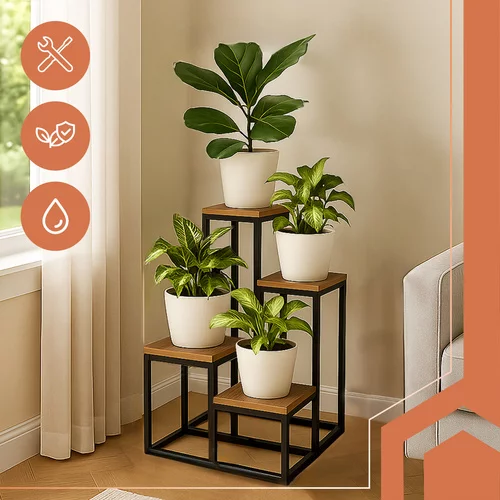 Štýlový štvorposchodový stojan na kvety v loftovom štýle ponúka elegantné a praktické riešenie pre vystavenie rastlín doma, na balkóne alebo terase. Vďaka stabilnej kovovej konštrukcii je bezpečný a odolný, minimalistický dizajn sa hodí do každého interiéru. Viac úrovní umožňuje umiestniť viac kvetín na malom priestore a zároveň zachovať funkčnosť a estetiku.