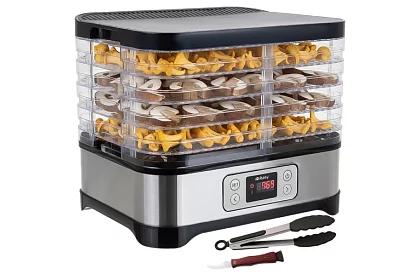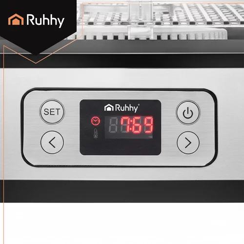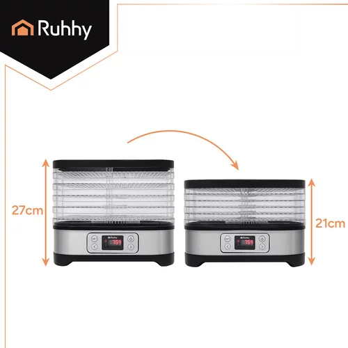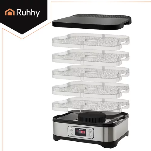 Sušička potravín RUHHY umožňuje jednoducho pripraviť domáce zásoby na celý rok. Rovnomerne suší huby, ovocie, zeleninu aj bylinky vďaka 5 tácam s objemom 10 litrov, presnej regulácii teploty 35–70 °C a 24-hodinovému časovaču. Prehľadný LCD displej a intuitívny ovládací panel zabezpečujú pohodlné, čisté a energeticky úsporné sušenie, zatiaľ čo sada praktického príslušenstva umožňuje okamžité použitie a univerzálne spracovanie surovín.