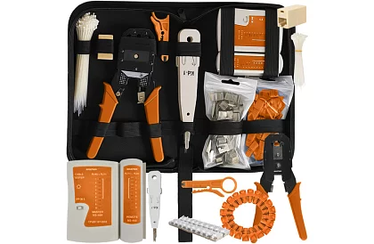 • Kompletné sieťové náradie – krimpovacie kliešte, odizolovacie kliešte, dierovač, konektory RJ45 a krytky