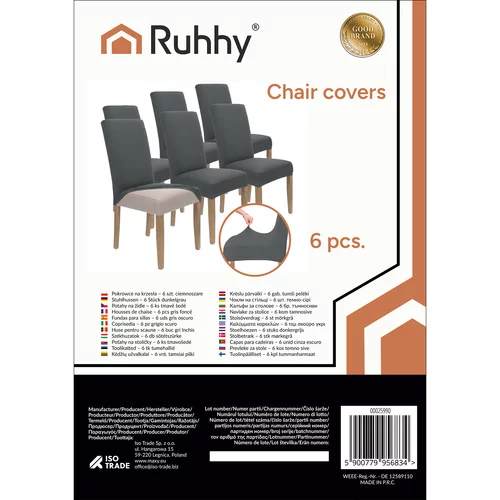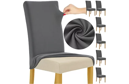 Potahy RUHHY spájajú eleganciu, pohodlie a ochranu stoličiek. Vyrobené z mäkkého polyesteru a elastického spandexu, dokonale priliehajú k každej stoličke a chránia ju pred nečistotami a poškodením. Tmavošedá farba sa hodí do rôznych interiérových štýlov a univerzálna veľkosť 65 × 40 × 35 cm padne na väčšinu štandardných stoličiek.