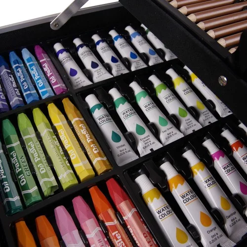 Kompletná umelecká sada v praktickom kufríku obsahuje všetko, čo potrebujete na maľovanie, kreslenie a tvorenie. Každý prvok je starostlivo usporiadaný, takže zostáva prehľadný a chránený pred poškodením. Sada je ideálna pre deti aj dospelých, ponúka pestrú škálu farieb, fixy, pastelky, akvarelové aj akrylové farby a praktické príslušenstvo, ktoré podporuje kreativitu, koncentráciu a jemnú motoriku.