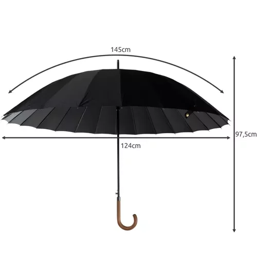 Veľký dáždnik ponúka mimoriadne elegantný vzhľad, vhodný pre ženy aj mužov, a poskytuje dokonalú ochranu pred dažďom vďaka veľkej kopuli. Robustná konštrukcia zaisťuje stabilitu aj pri silnom vetre a drevená rukoväť poskytuje pohodlný a bezpečný úchop. Vďaka systému One Click je otváranie a zatváranie rýchle, bezpečné a šetrné, bez striekajúcej vody na okolie.