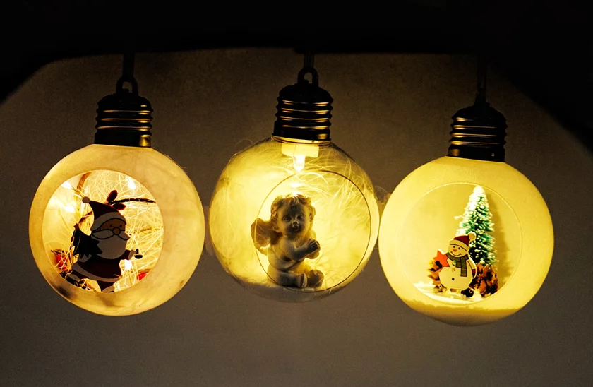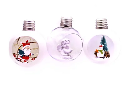 Dekoratívne vianočné banky, vianočná ozdoba obľúbená na výzdobu a k aranžovaniu. Každá banka má svoje LED osvetlenie, ktoré dokreslí detaily výzdoby vo vnútri banky. Súprava obsahuje 3 banky, jedna je prehľadná s malým anjeličkom a dve biele v semišovej úprave s vianočným témou vo vnútri banky.