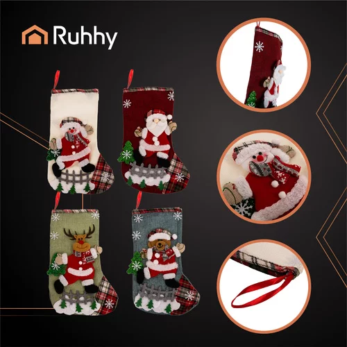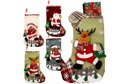 Vnáša vianočné čaro do každého interiéru a slúži ako dekoratívne balenie darčekov. Sada štyroch priestorových ponožiek s motívmi Santa Clausa, sobov, snehuliakov a medvedíkov umožňuje vytvoriť efektnú a ucelenú dekoráciu, ktorá okamžite upúta pozornosť a poteší hostí. Ponožky kombinujú praktickú veľkosť s luxusným vianočným dizajnom, takže sú vhodné pre drobné darčeky, sladkosti alebo dekorácie.