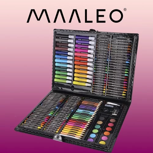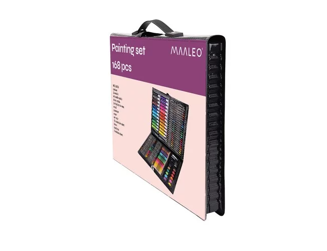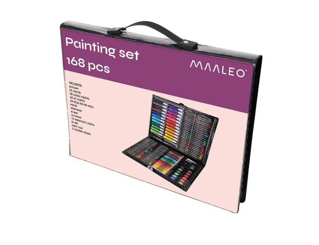 168 prvkov – obrovský výber 24 pasteliek, 24 fixiek, 48 olejových pasteliek, 48 sviečkových pasteliek, 12 akvarelových farieb, štetec, maliarska paleta, orezávač, ceruzka, guma, lepidlo, korektor a 5 listov papiera A4 umožňuje vytvoriť najkreatívnejšie, originálne a náročné diela.