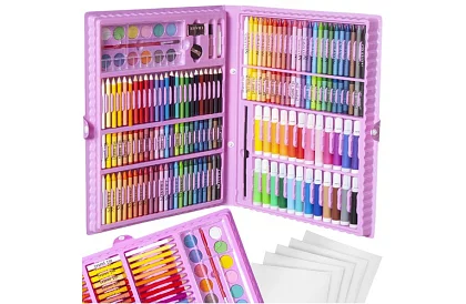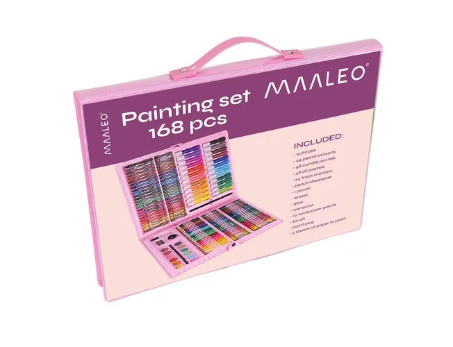 168 prvkov – súprava obsahuje 24 pasteliek, 24 fixiek, 48 olejových pasteliek, 48 sviečkových pasteliek, 12 akvarelových farieb, štetec, maliarsku paletu, orezávač, ceruzku, lepidlo, korektor, gumu a 5 listov papiera A4, takže deti ľahko vytvoria najkreatívnejšie a originálne diela.