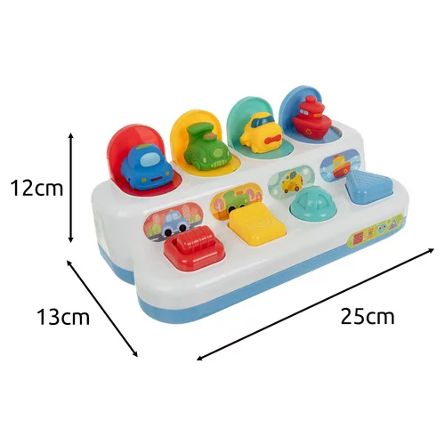 Interaktívna vzdelávacia hračka podporuje rozvoj dieťaťa hravou formou. Stlačením tlačidiel, páčok alebo gombíkov sa objavia farebné vozidlá, čo pomáha rozvíjať koordináciu ruka-oko, jemnú motoriku i logické myslenie. Vďaka kompaktným rozmerom je ideálna na hranie doma aj na cestách a zároveň učí dieťa vzťah príčiny a následku zábavným spôsobom.