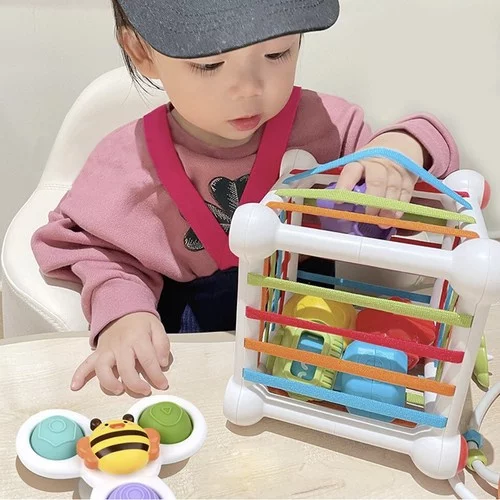 Flexibilná kocka je skvelá vzdelávacia hračka, ktorá stimuluje zmysly dieťaťa a podporuje rozvoj jemnej motoriky, koncentrácie a logického myslenia. Dieťa môže vkladať a vyberať bloky cez pružné steny, učiť sa farby, tvary a štruktúry a zároveň sa baviť vďaka chrastiacim blokom. Šesť farebných blokov a pružné steny zabezpečia hodiny zábavy a bezpečného objavovania.