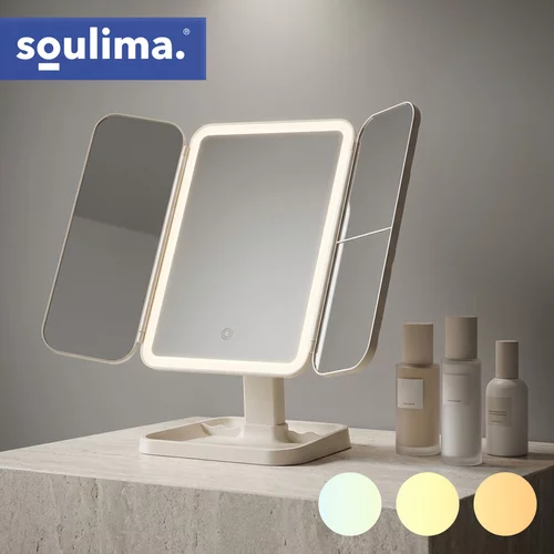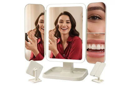 Kosmetické zrkadlo ponúka komplexný pohľad na tvár a účes vďaka trojdielnej konštrukcii s centrálnym zrkadlom a dvoma bočnými krídlami. Bočné pravé zrkadlo so zväčšením 2x a 3x umožňuje precízne úpravy očných liniek, obočia a ďalších detailov líčenia. Vstavané LED osvetlenie s nastaviteľnou farebnou teplotou 3000–7000 K zabezpečuje pohodlné líčenie za rôznych svetelných podmienok a verné zobrazenie farieb. Vďaka otočeniu až o 270° a nastaviteľnému uhlu sklonu je zrkadlo pohodlné na použitie vsedě aj vestoje. Štýlová diamantovo prešívaná predná strana chráni sklo a pôsobí ako elegantný dekoratívny prvok. Vstavaná batéria 600 mAh s USB-C nabíjaním umožňuje flexibilné používanie bez neustáleho pripájania k sieti.